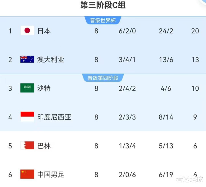 三连败后,国足8轮积6分小组垫底,仅存争夺第四名(附加赛资格)的理论可能。最后两轮需全胜印尼、巴林,且净胜球反超印尼(目前国足-13,印尼-6)。